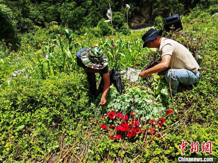 圖為民警鏟除野生罌粟現(xiàn)場?!∪湛t市公安局禁毒支隊(duì)供圖