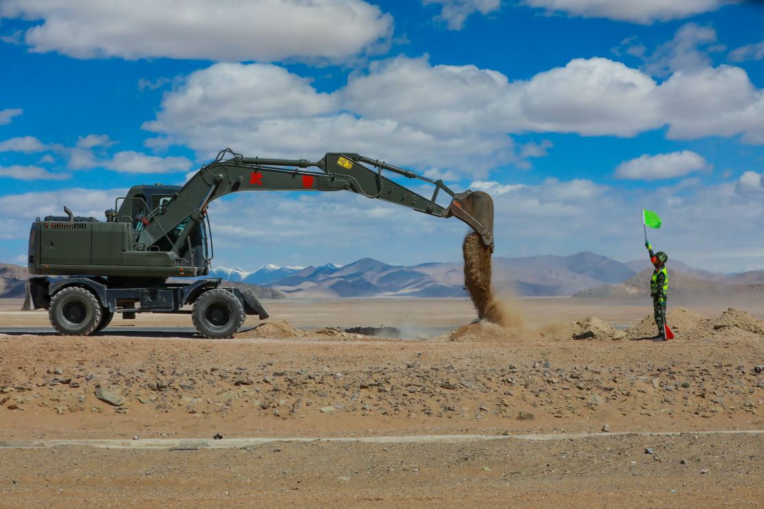 中午時(shí)分,紫外線(xiàn)異常強(qiáng)烈,伴隨著狂風(fēng)卷起的沙粒,打在臉頰陣陣作痛。在茫茫無(wú)人區(qū),放眼望去只見(jiàn)官兵來(lái)回穿梭在天路的忙碌身影,挖掘機(jī)回填路基、裝載機(jī)運(yùn)送砂石料、平地機(jī)攤鋪路面、壓路機(jī)壓實(shí)路基、瀝青車(chē)燒制拌合瀝青……官兵們井然有序,在各自戰(zhàn)位各司其職,一段段損壞的道路隨后就被修復(fù)一新。