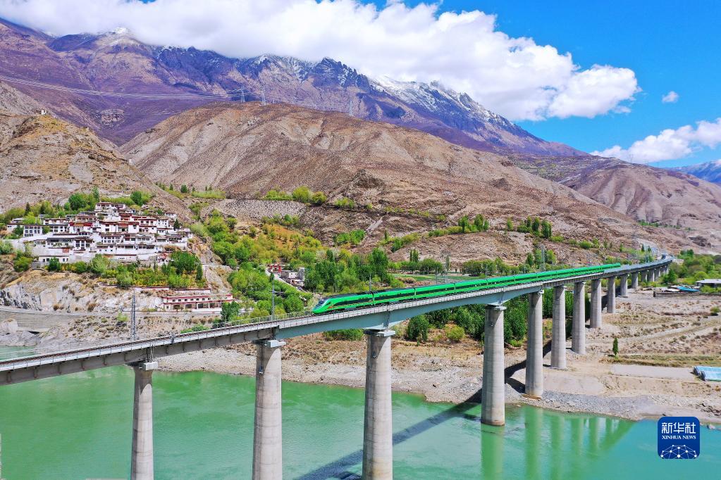 復(fù)興號列車行駛在西藏朗縣境內(nèi)(2022年4月14日攝)。新華社記者 覺果 攝