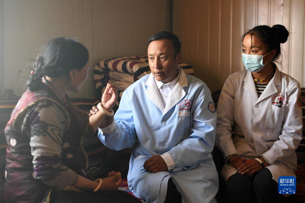在治多縣索加鄉(xiāng)當(dāng)曲村,布久索南更青(中)在牧民家給牧民看?。?月11日攝)。新華社記者 范培珅 攝