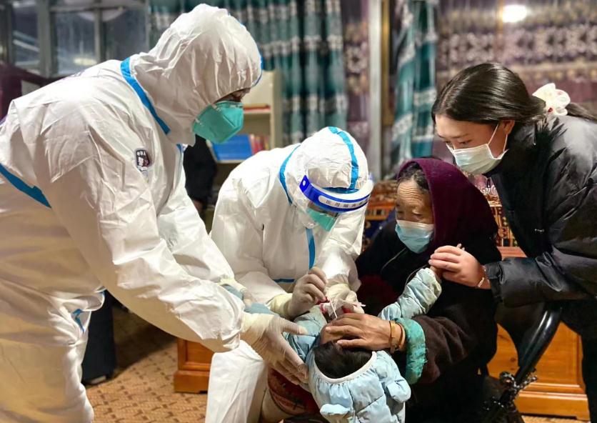 圖為西藏山南邊境管理支隊(duì)普瑪江塘邊境派出所移民管理警察協(xié)助醫(yī)務(wù)人員為轄區(qū)群眾進(jìn)行核酸檢測(cè)。涂奇源 攝