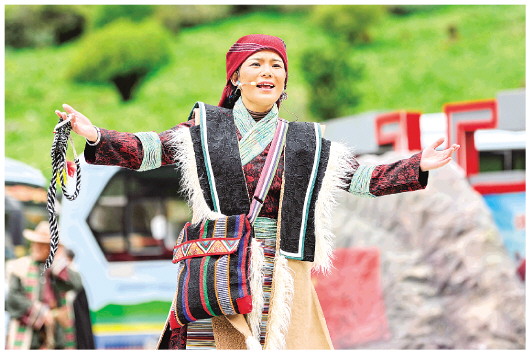 5月31日,演員在隆子縣玉麥鄉(xiāng)文化廣場(chǎng)表演歌舞劇《天邊格?;ā?。 新華社記者張汝鋒攝