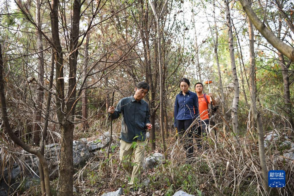 9月21日,在廣東韶關(guān)樂昌市秀水鎮(zhèn)大羅嶺村,白拉曲珍(中)和師傅江建發(fā)(前)、同事伍國清在石漠化生態(tài)恢復(fù)監(jiān)測(cè)平臺(tái)固定樣地工作。新華社記者 鄧華 攝