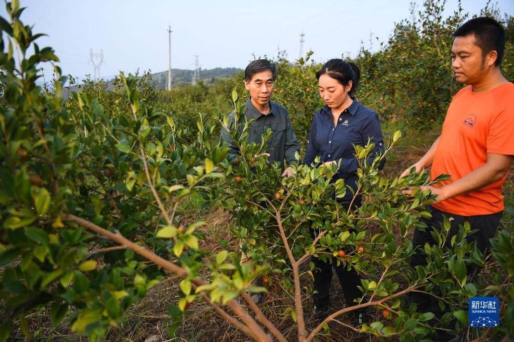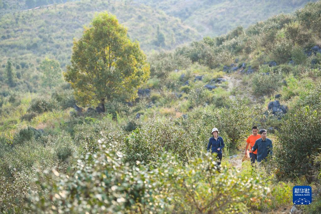 9月21日,在廣東韶關(guān)樂昌市梅花鎮(zhèn)流山村,白拉曲珍(左)和師傅江建發(fā)(右)、同事伍國清來到石漠化綜合治理的油茶種植基地查看油茶生長(zhǎng)情況。新華社記者 鄧華 攝