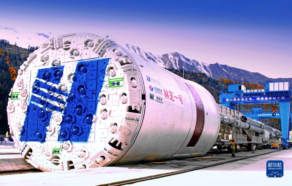 派墨公路多雄拉隧道施工采用的“林芝一號(hào)”全斷面雙護(hù)盾硬巖掘進(jìn)機(jī)(TBM)完成組裝并順利進(jìn)行首次滑行(2015年10月29日攝)。新華社發(fā)(董志雄 攝)