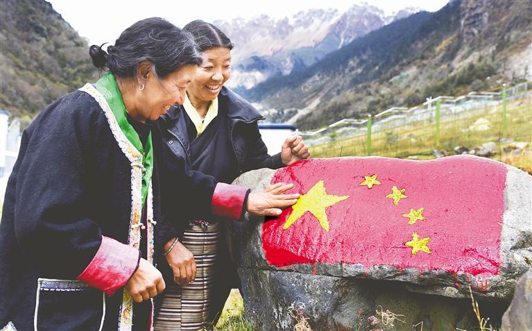 圖為“家是玉麥,國是中國”,人人爭做神圣國土守護者、幸福家園建設(shè)者。圖為“七一勛章”獲得者卓嘎和同為“時代楷模”的妹妹央宗抵邊巡邏。