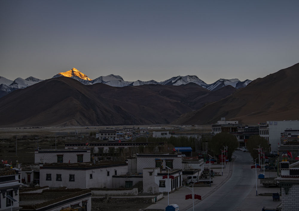 這是扎西宗鄉(xiāng)一角,遠(yuǎn)處金色山峰為珠穆朗瑪峰(5月10日攝)。新華社記者 孫非 攝