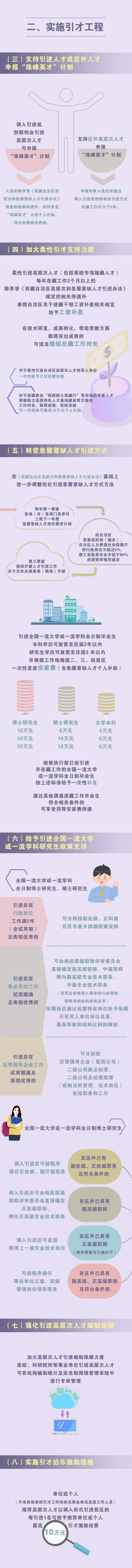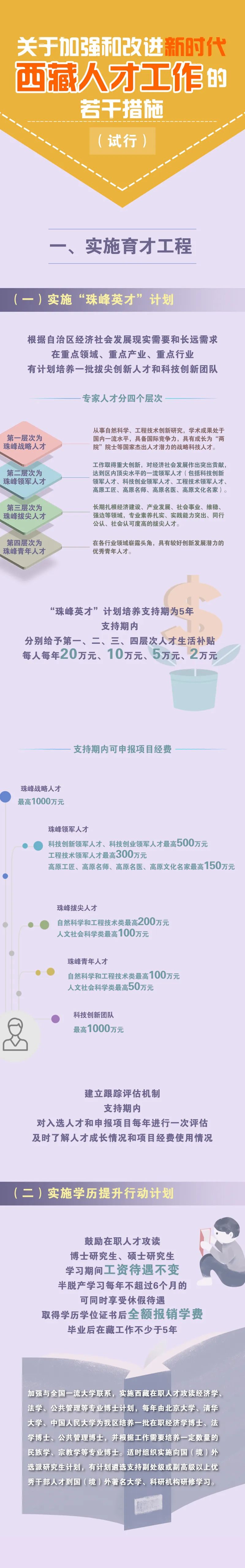 實施“珠峰英才”計劃,每年遴選支持一批珠峰戰(zhàn)略人才、珠峰領(lǐng)軍人才、珠峰拔尖人才、珠峰青年人才和科技創(chuàng)新團隊,在5年支持期內(nèi)給予生活補貼和項目經(jīng)費支持,項目經(jīng)費最高可申請1000萬元。實施學歷提升行動,支持在職人才攻讀研究生,并協(xié)調(diào)全國頂尖高校為西藏定向培養(yǎng)博士研究生。