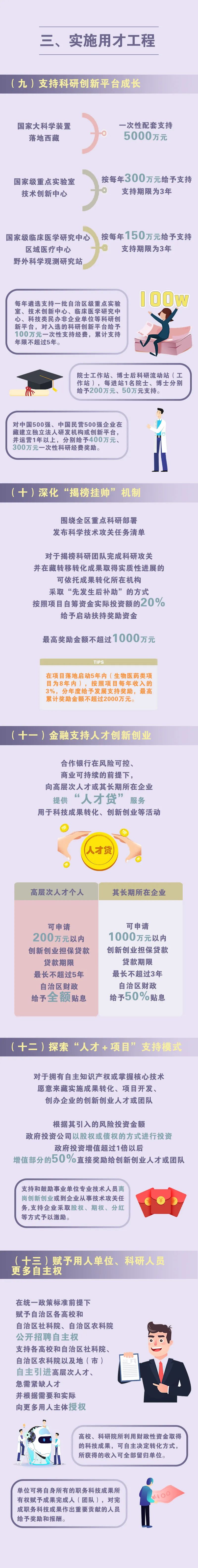 支持科研創(chuàng)新平臺成長,對重點實驗室、技術(shù)創(chuàng)新中心以及院士工作站、博士后科研流動站(工作站)等給予經(jīng)費支持。深化“揭榜掛帥”機制,對完成科研攻關(guān)并在藏轉(zhuǎn)化成果取得實質(zhì)性進展的,給予啟動扶持獎勵資金、發(fā)展支持獎勵資金。向高層次人才或其長期所在企業(yè)提供“人才貸”服務(wù),自治區(qū)財政予以貼息。鼓勵創(chuàng)新創(chuàng)業(yè)人才或團隊來藏實施成果轉(zhuǎn)化、項目開發(fā)、創(chuàng)辦企業(yè),政府投資公司參與創(chuàng)新創(chuàng)業(yè)項目,政府投資增值的部分收益可直接用于獎勵。在統(tǒng)一政策標準、嚴格執(zhí)行規(guī)定前提下,賦予用人單位、科研人員更多自主權(quán)。