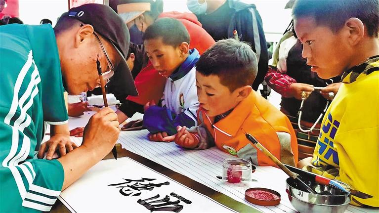 圖為阿里地區(qū)書(shū)畫(huà)家進(jìn)社區(qū)活動(dòng)現(xiàn)場(chǎng),為群眾書(shū)寫(xiě)扎西德勒。通訊員 唐磊 攝