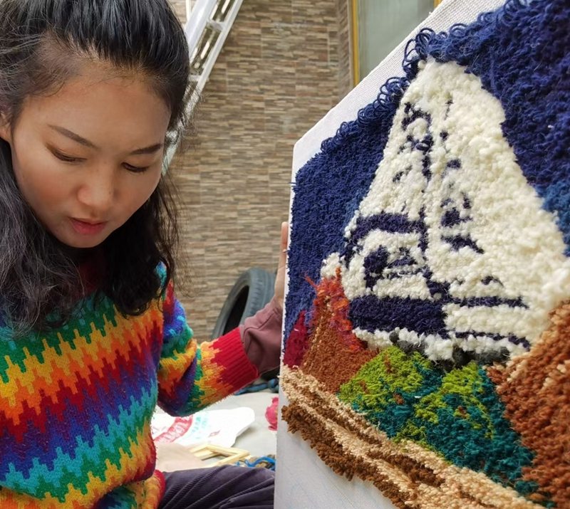 不過,起初也遇到了不少困難和挑戰(zhàn)?!鞍⒓褌儯ú卣Z:對年長女性的尊稱)的編織手藝都很棒,但她們幾乎沒上過學,拘泥于傳統(tǒng)思維,創(chuàng)新力不足,做出來的產品花樣陳舊,一直打不開市場。而且她們對很多新鮮事物的接受度低,不愿意改變。比如她們只做色彩鮮艷的氆氌(藏族人民手工生產的一種毛織品,可做衣服、床毯等)。我想打破慣常思維,做一些時髦的產品出來?!贝稳是浠貞洝?/p>