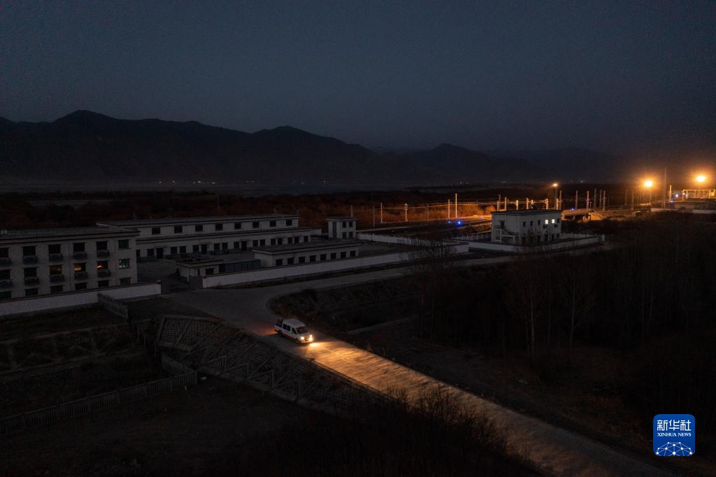 羅布和同事駕車駛出拉林鐵路扎囊工電綜合工區(qū),趕往鋼軌探傷作業(yè)點(diǎn)(1月12日攝,無(wú)人機(jī)照片)。新華社記者 孫非 攝