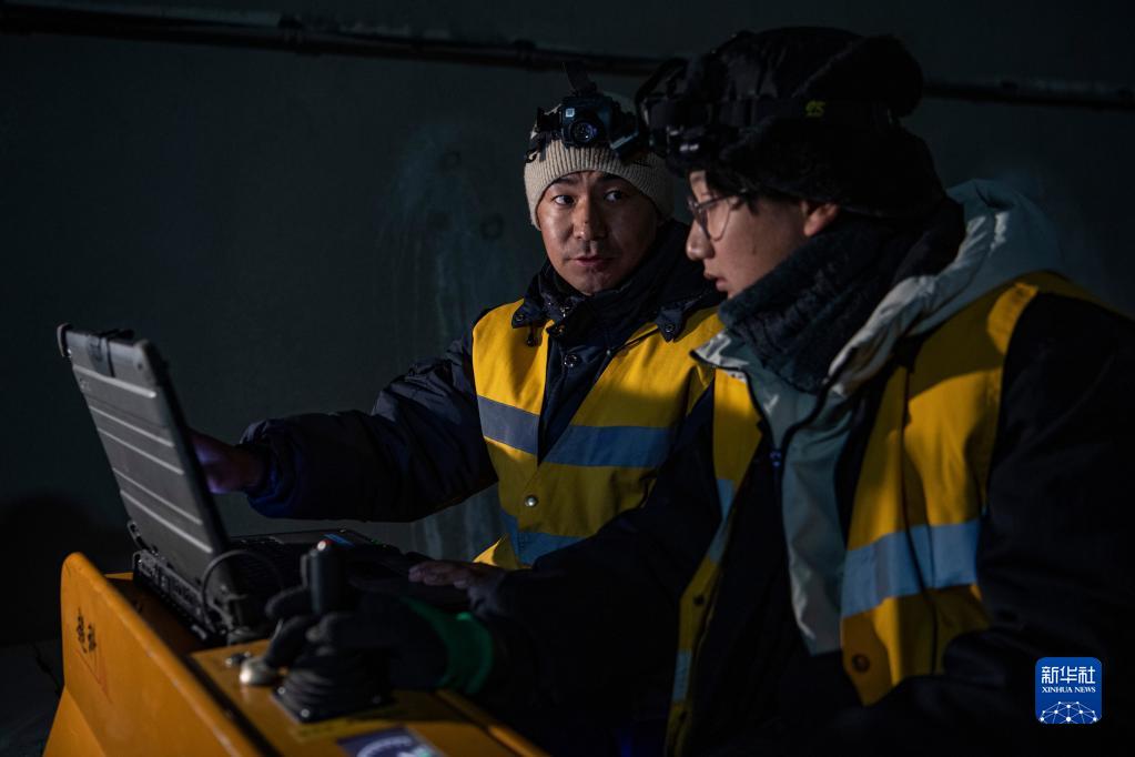羅布(左)和同事對(duì)鋼軌的疑似傷損波形進(jìn)行確認(rèn)(1月12日攝)。新華社記者 孫非 攝