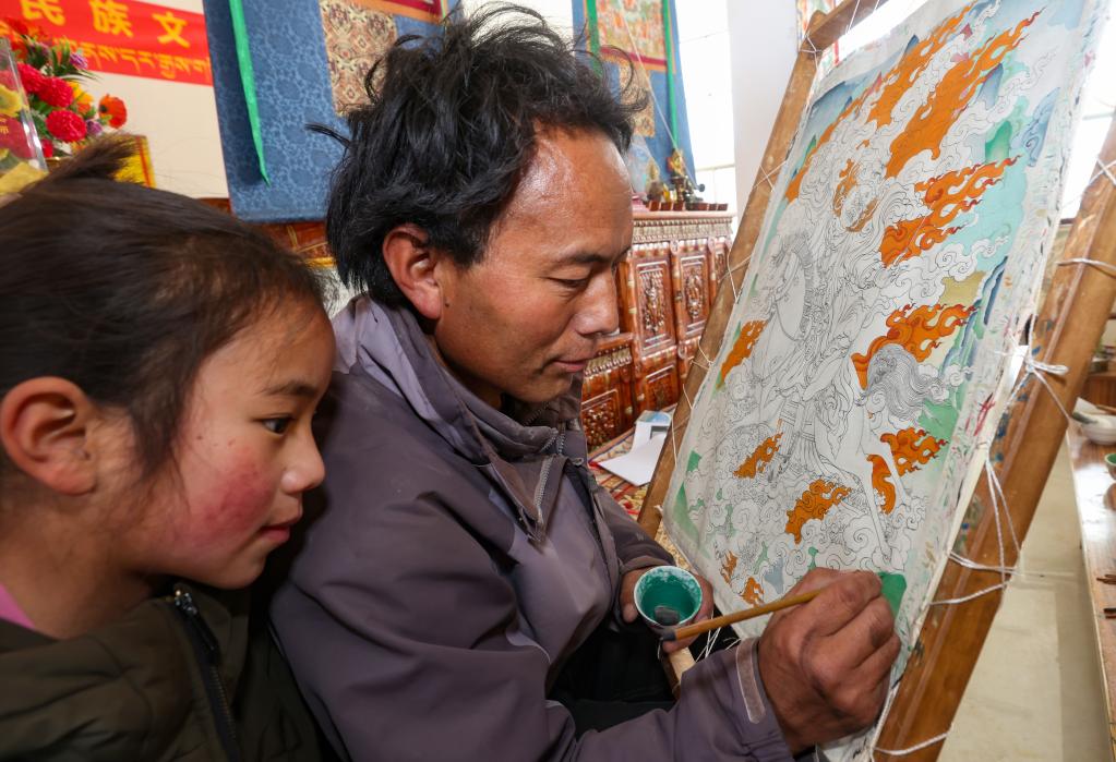 嘎桑堅參(右)在為唐卡上色(1月11日攝)。新華社記者 姜帆 攝