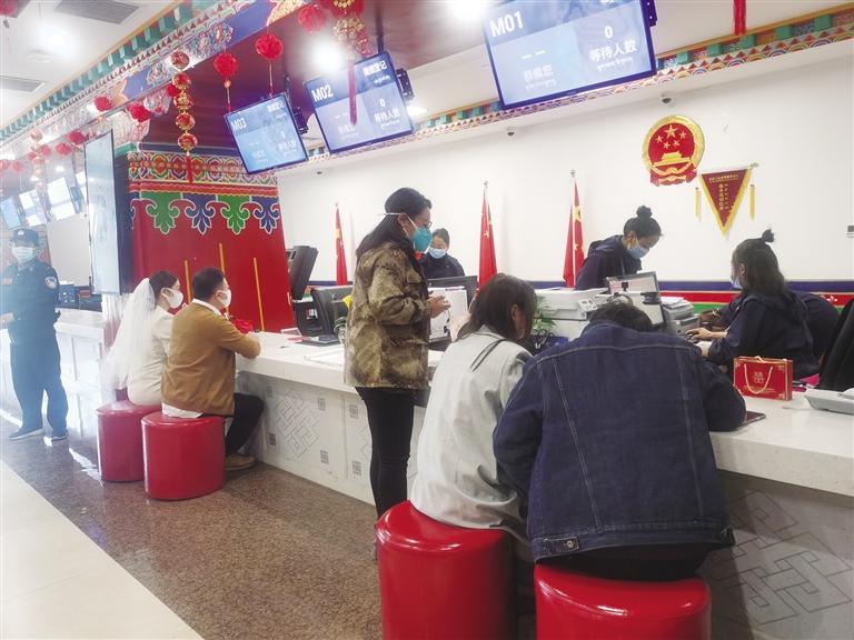 14日一大早,記者在拉薩三級政務服務大廳婚姻登記處看到,大廳里坐滿了前來登記領證的情侶,工作人員正在有序地為新人辦理證件。記者注意到,前來登記領證的新人或手捧鮮花,或頭戴白紗,或好友一路跟拍,臉上洋溢著幸福的笑容。為了營造浪漫的節(jié)日氛圍,婚姻登記處的工作人員也在大廳和禮堂內(nèi)精心擺放了寓意為“百年好合”的百合花。