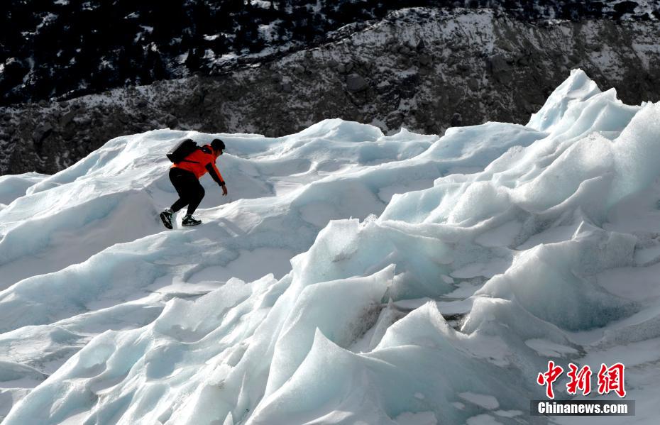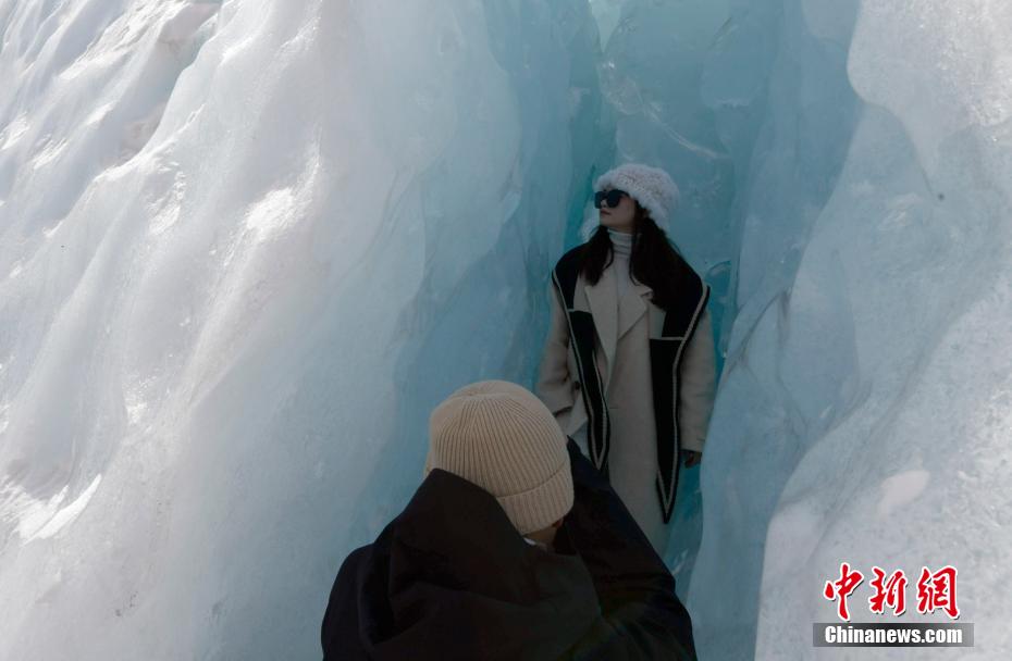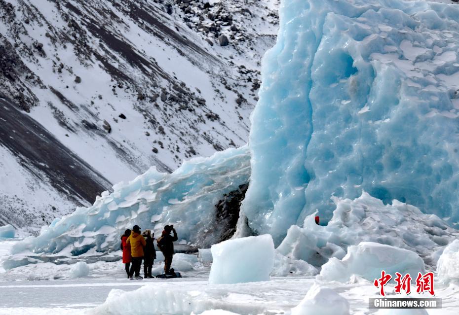 2月16日,西藏昌都來古冰川,游客拍照留念。來古冰川屬海洋性冰川,為一組冰川的統(tǒng)稱,其位于西藏昌都八宿縣然烏鎮(zhèn)境內(nèi),緊鄰然烏湖,是帕隆藏布的源頭。冬天的來古冰川有著別樣的景致,陽光照射下顯出藍色,吸引眾多游客前來觀賞。