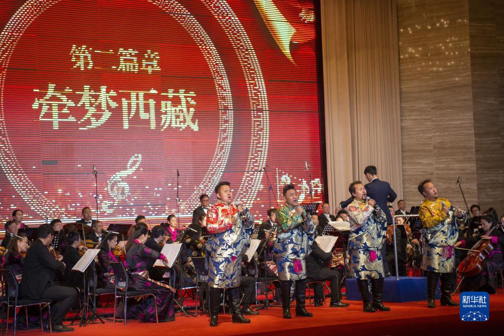 2月18日,雪域之子組合在2023年藏歷新年音樂(lè)會(huì)上演唱《父母恩情》。新華社發(fā)(旦增努布攝)