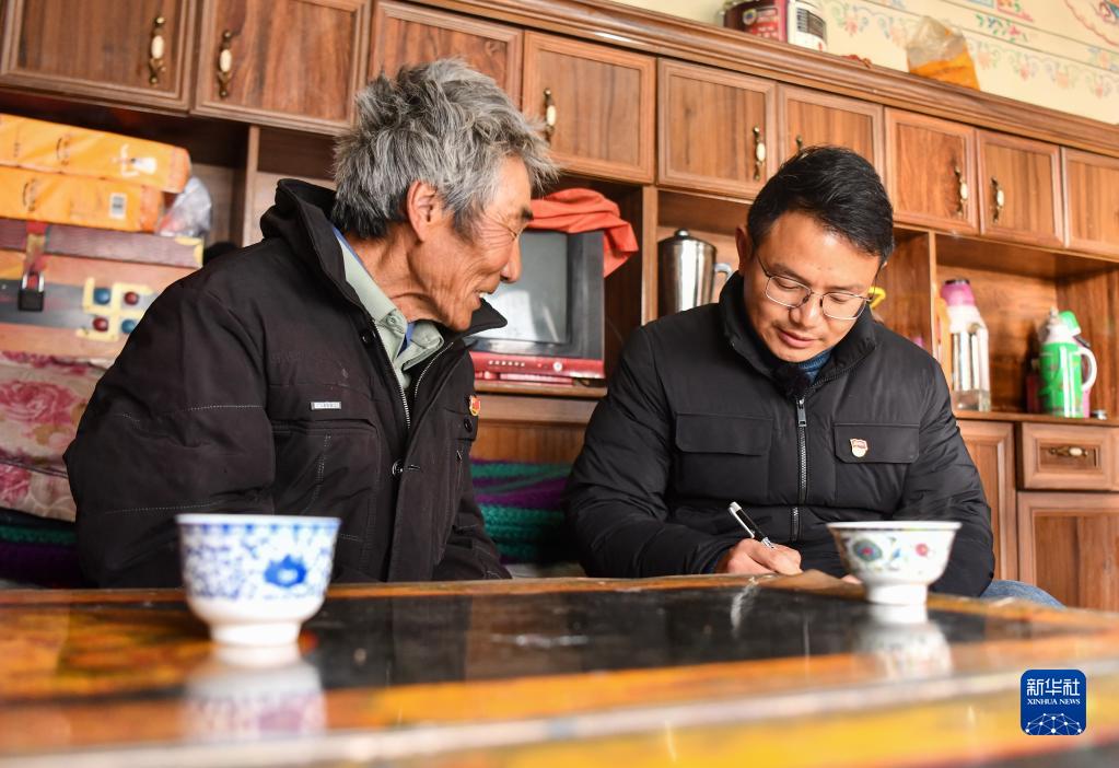 扎西江村(右)在慰問(wèn)老黨員索朗,了解搬遷群眾生活情況(2月15日攝)。新華社記者 晉美多吉 攝