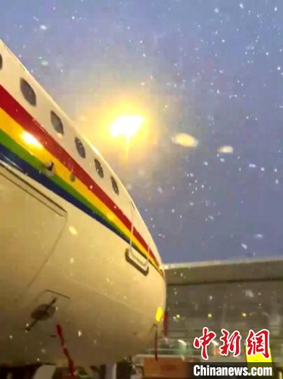 圖為拉薩貢嘎國際機(jī)場(chǎng)夜間降雪。民航西藏自治區(qū)管理局供圖