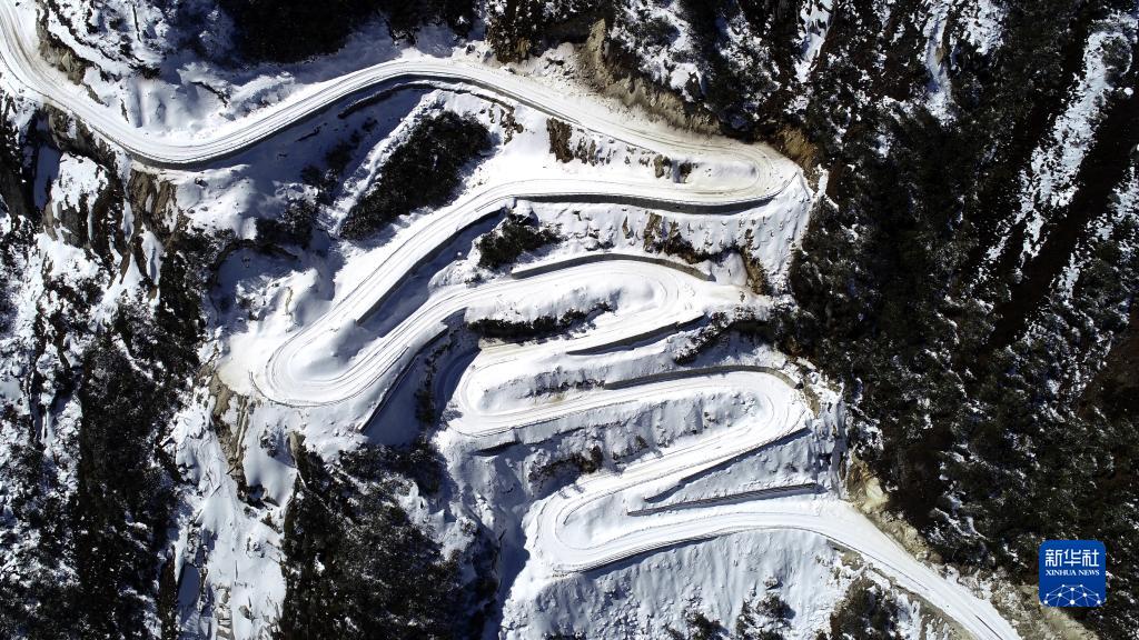 西藏洛扎縣境內(nèi)懸崖峭壁間的通村公路(2022年1月17日攝,無(wú)人機(jī)照片)。新華社記者韓曦樂(lè) 攝