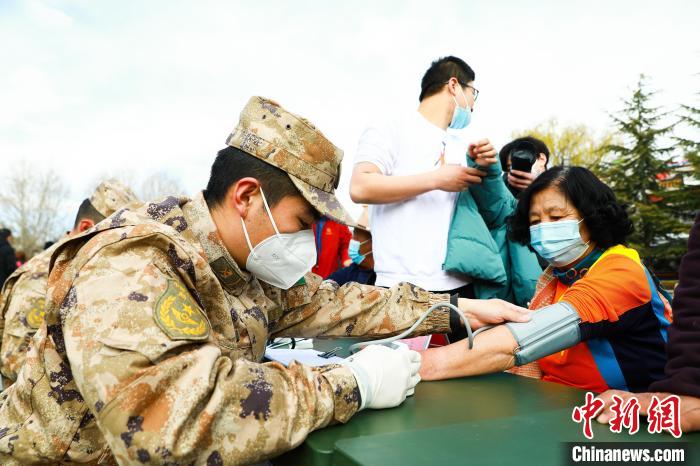 圖為官兵為民眾測(cè)量血壓。 拉薩警備區(qū)某團(tuán)供圖