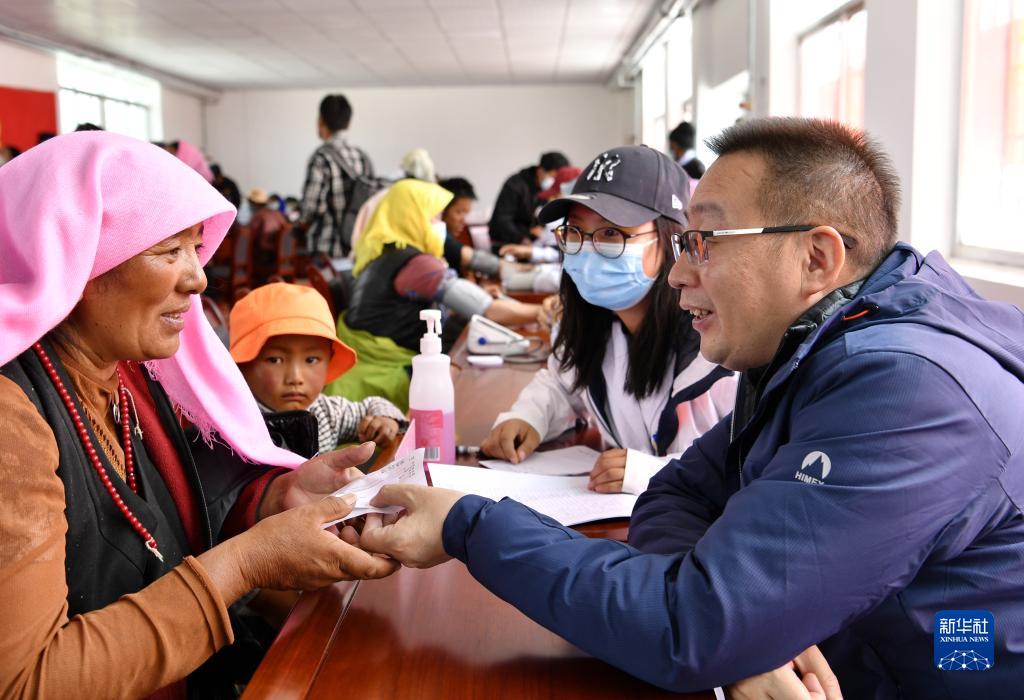 北京市第七批“組團(tuán)式”援藏醫(yī)療隊(duì)專家、拉薩市人民醫(yī)院副院長汪紅兵(右)為居民義診(2022年6月9日攝)。新華社記者 張汝鋒 攝