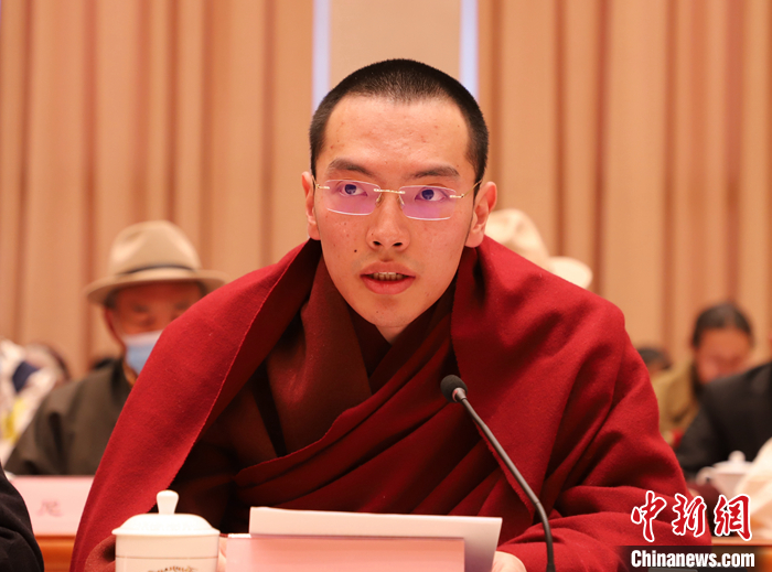 圖為宗教界代表達隆夏仲·阿旺洛桑·旦增曲吉尼瑪在座談會上發(fā)言。 中新社記者 趙延 攝