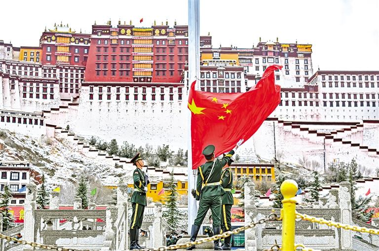 圖為拉薩市舉行“升國旗、唱國歌”儀式,隆重紀(jì)念西藏百萬農(nóng)奴解放64周年。記者 潘多 攝