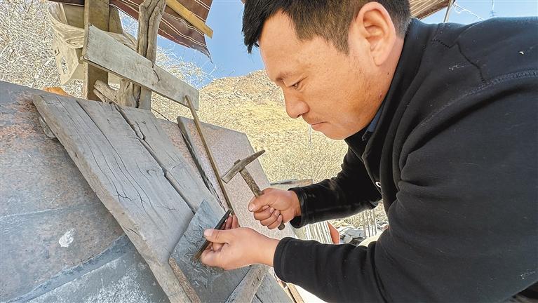 在拉薩市城關區(qū)金珠西路街道當巴路上有好幾家傳統(tǒng)石刻技藝的工作坊,房前屋后堆滿了各式各樣的石頭及雕刻成品。一塊石板置在木架上,桑周才仁席地而坐,手執(zhí)一把細長的刻刀,聚精會神地用鐵錘有節(jié)奏地敲擊著刻刀尾部,在石板上雕刻吉祥八寶中的蓮花。布滿厚繭的雙手像堅實渾厚的巖石,這是桑周才仁對這門技藝堅守的沉淀。“干我們這活就是特別臟特別累,一坐就是一整天。”面對記者的來訪,滿身灰塵和顏料的他顯得有點不好意思。