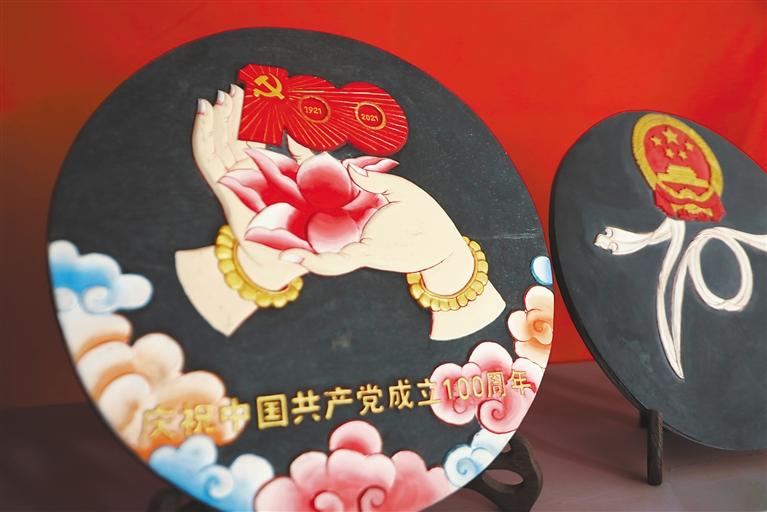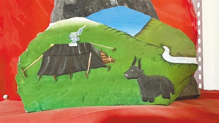 “我們首先要選好一塊石頭,根據(jù)它的形狀和質地來決定刻成一幅什么樣的作品,然后再畫出作品的輪廓進行雕刻,最后一步則為上色。”桑周才仁熱情地帶我們參觀他的工作室,“慶祝中國共產黨成立100周年”“牧家生活”“扎西德勒”“白海螺”“和氣四瑞像”……每一幅作品活靈活現(xiàn)在大大小小石板上,栩栩如生、惟妙惟肖,堅硬的石頭在他出神入化的雕工下竟變得柔軟,又不失力量和美感。