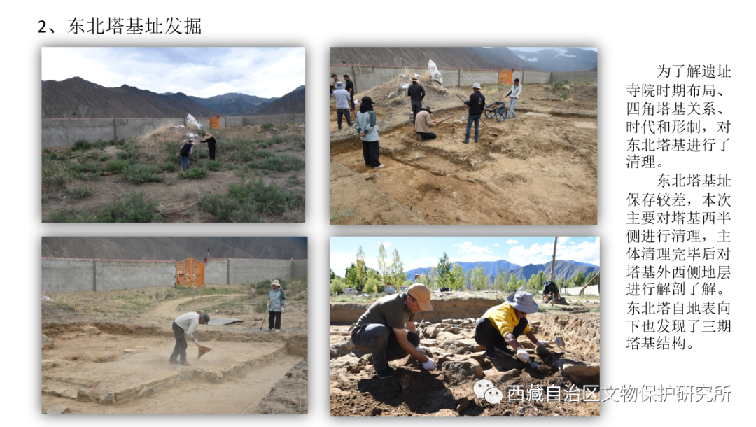2022年,溫江多考古隊對遺址西南塔北側塔基、東北塔基址進行了清理發(fā)掘,對遺址中區(qū)西部地層進行了解,對遺址南部五峰山部分區(qū)域進行了調查。發(fā)掘面積520平方米,出土磚、瓦、陶、石、骨、鐵等各類遺物標本100件。西南角和東北角兩座佛塔均發(fā)現了上下疊壓的早、中、晚三期塔基,兩座塔基的平面形制和規(guī)格基本一致,均為平面呈多折角“亞“字形,土石結構塔基,邊長均長約18米。遺址中區(qū)西部T0905探方內清理出墻址2處,臺基1處。兩道墻址一為南北向夯土墻,一為東西向石墻,均位于④層下,與晚期塔基為同一時期。臺基1位于⑥層下,北部為一道東西向石砌臺基,內部(南)為五花墊土層,與早期佛塔為同時期。調查工作在五峰山頂發(fā)現修行洞、修行點、小型塔基等共8處,在山北麓發(fā)現依山修建的具有一定規(guī)模的房居址、大型佛塔基址等共5處。