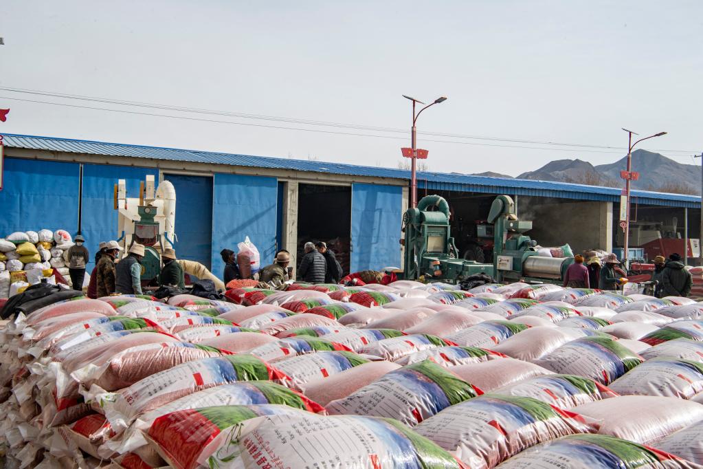 在西藏日喀則市江孜縣紫金鄉(xiāng)努堆村的農(nóng)機(jī)農(nóng)民專業(yè)合作社內(nèi),兩臺(tái)青稞種谷物精選機(jī)正開(kāi)足馬力,給新收獲的青稞良種過(guò)篩、除雜、包衣、裝袋,50公斤一袋的青稞良種已碼滿大半個(gè)院子。