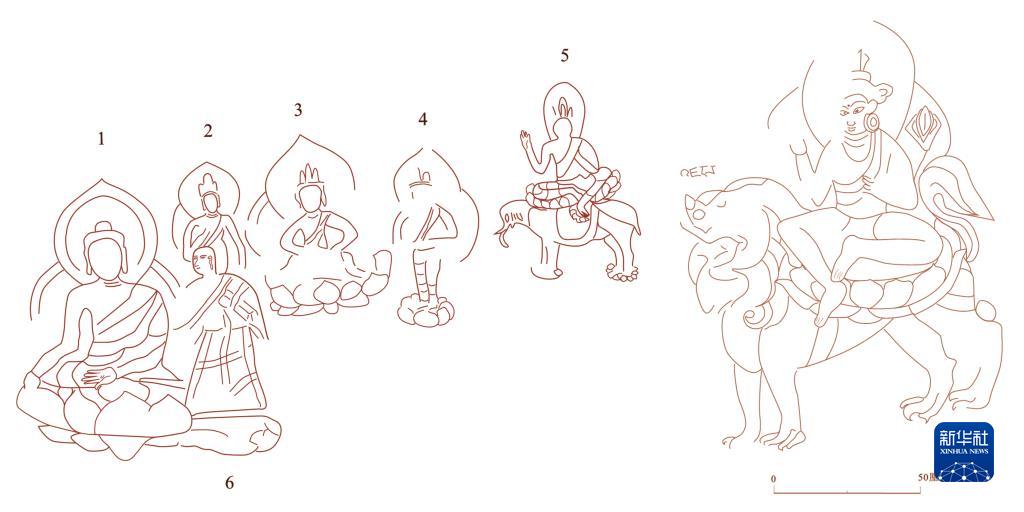 (左)查果西溝B點摩崖石刻造像分布示意圖,(右)然堆村騎獅文殊像。(摩崖石刻局部線圖由西藏自治區(qū)文物研究所提供)