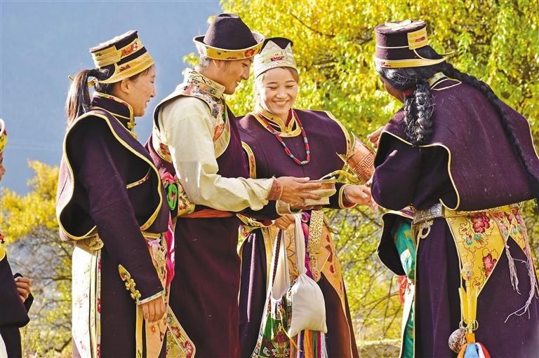 巴宜區(qū)布久鄉(xiāng)擁有濃厚的工布民俗文化氛圍,當(dāng)?shù)爻浞职l(fā)揮“旅游+民俗文化”的優(yōu)勢(shì),吸引游客前來(lái)體驗(yàn)。圖為布久鄉(xiāng)朵當(dāng)村身著傳統(tǒng)工布藏裝的村民。