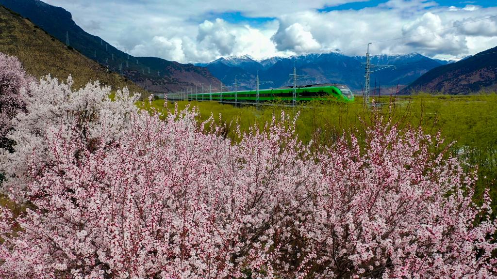 復(fù)興號(hào)列車(chē)行駛在兩側(cè)桃花盛開(kāi)的拉林鐵路上(無(wú)人機(jī)照片,3月25日攝)。新華社記者姜帆 攝