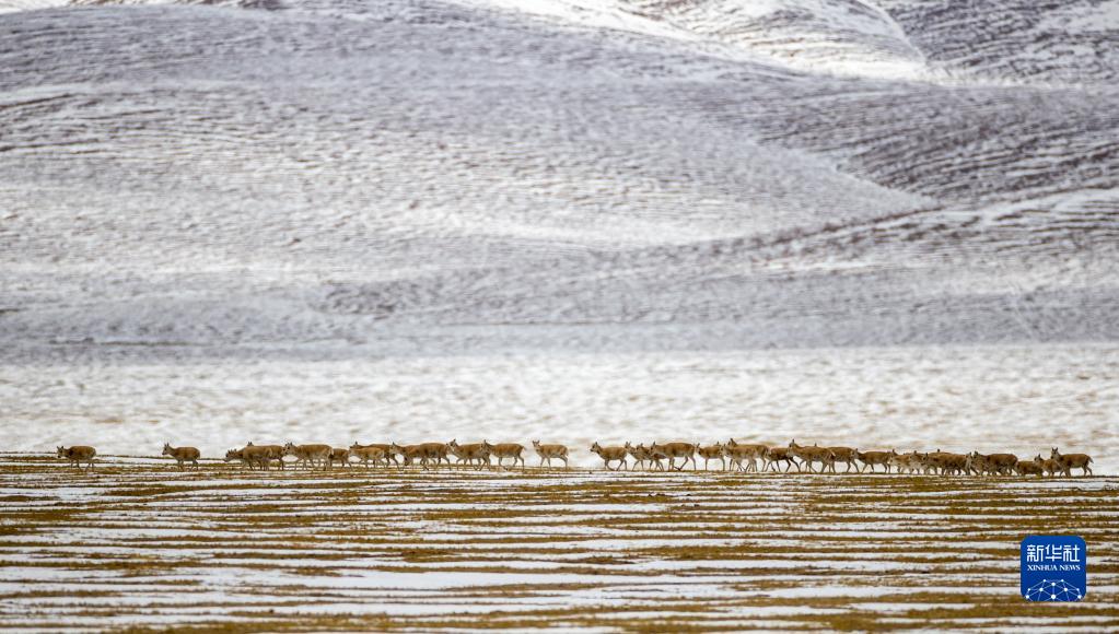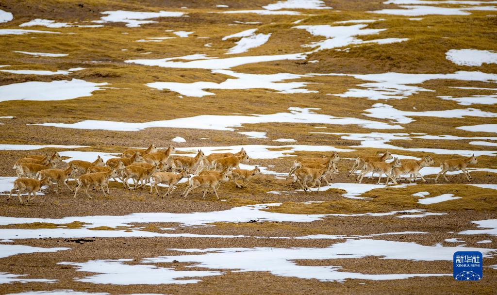這是在羌塘國家級自然保護(hù)區(qū)那曲市雙湖縣區(qū)域內(nèi)拍攝到的藏羚羊群(4月17日攝) 。新華社記者 姜帆 攝