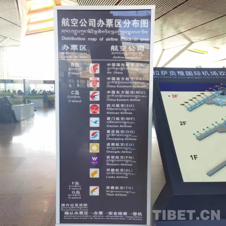 無托運(yùn)行李的旅客持個人身份證(或有效證件)前往自助值機(jī)區(qū)打印登機(jī)牌。有托運(yùn)行李和中轉(zhuǎn)聯(lián)程航班的旅客前往人工柜臺辦理。其中,乘坐西藏航空公司航班的旅客進(jìn)入出發(fā)大廳后左轉(zhuǎn)前往F、G島辦理乘機(jī)手續(xù),其他航空公司的旅客請前往B、C、D島辦理乘機(jī)手續(xù)。