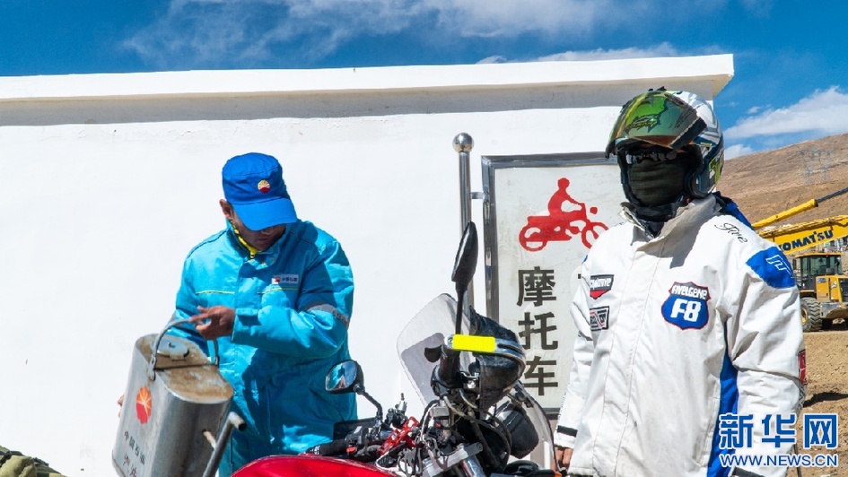 邊巴頓珠正在為游客的摩托車加油(5月16日攝) 。新華網(wǎng)發(fā) 洛桑旺堆 攝