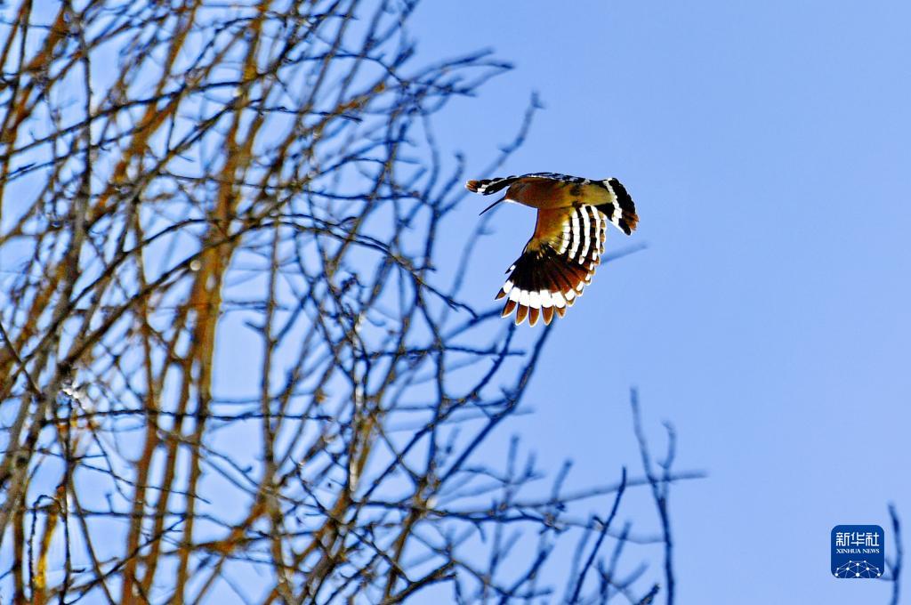 戴勝在拉薩市城關區(qū)蔡公堂街道次角林村上空飛過(5月14日攝)。新華社記者 張汝鋒 攝