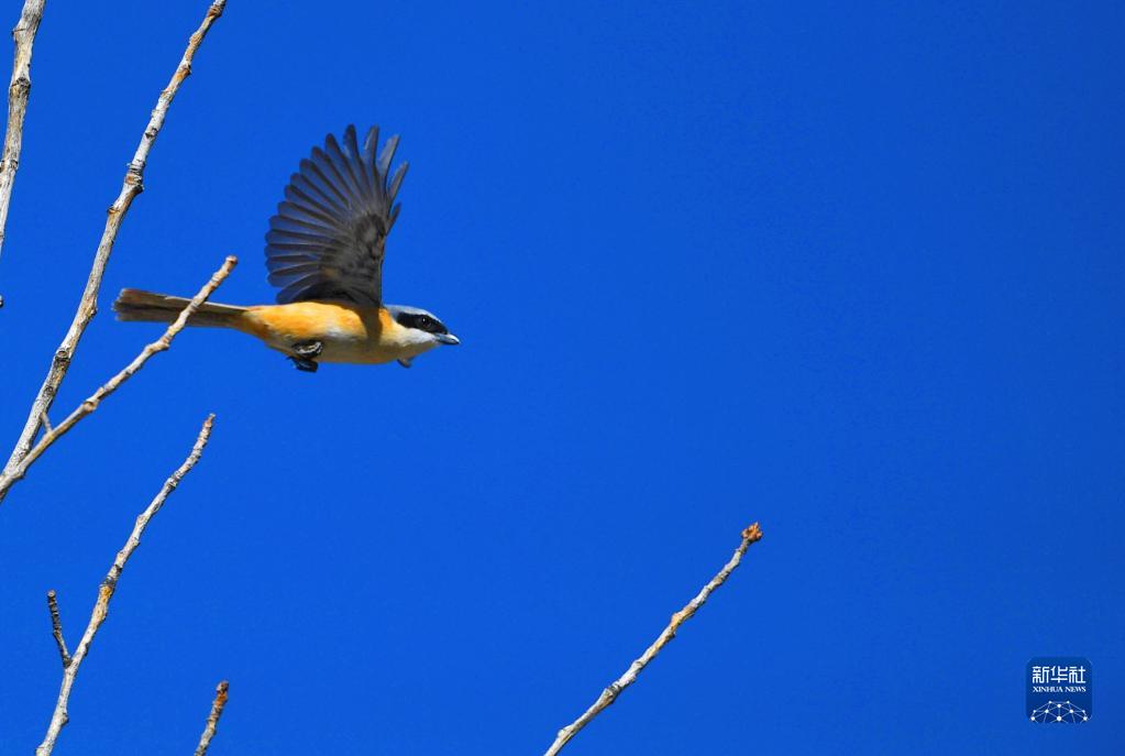 灰背伯勞在拉薩市城關區(qū)蔡公堂街道次角林村上空飛過(5月14日攝)。新華社記者 張汝鋒 攝
