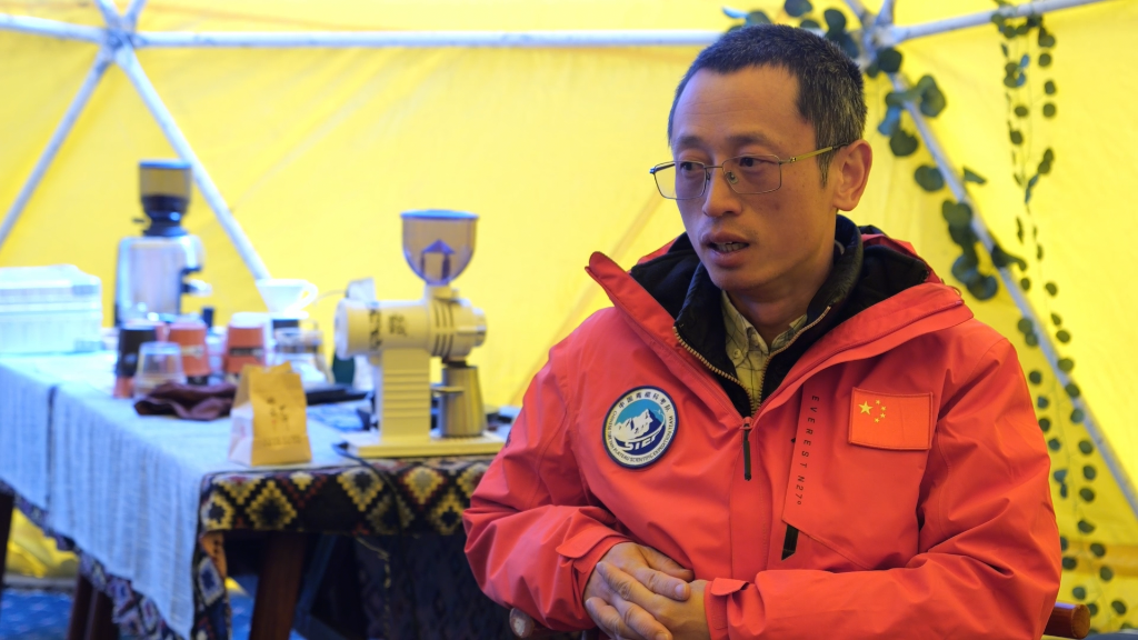 中國(guó)科學(xué)院西雙版納熱帶植物園的研究員蘇濤在珠峰登山大本營(yíng)接受新華社記者采訪。