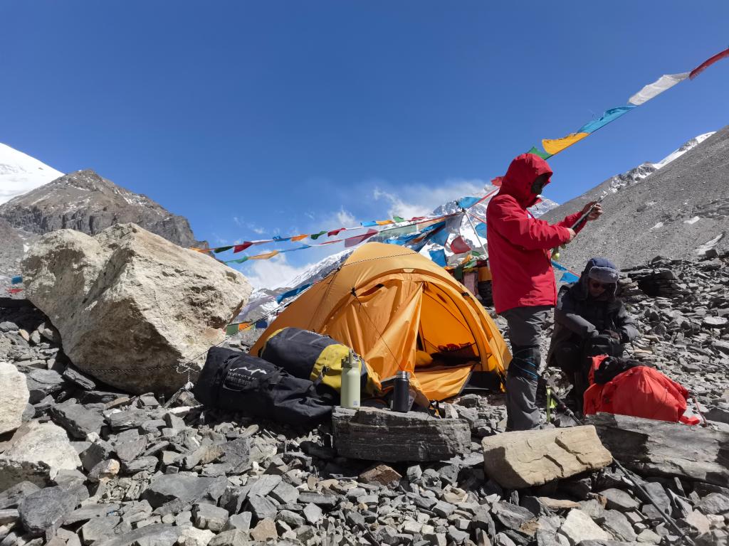 古生物科考分隊(duì)在珠峰開(kāi)展野外科學(xué)考察活動(dòng),研究員蘇濤(左一)與隊(duì)員在山中尋找避風(fēng)處露營(yíng)。采訪對(duì)象供圖。
