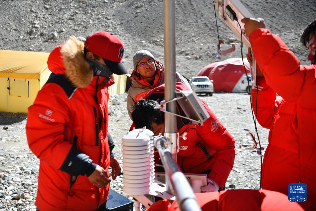 在珠峰登山大本營附近,第二次青藏科考高海拔氣象梯度觀測小組負責人趙華標(中)在指導(dǎo)科考登頂隊隊員架設(shè)自動氣象站(5月9日攝)。新華社記者 晉美多吉 攝