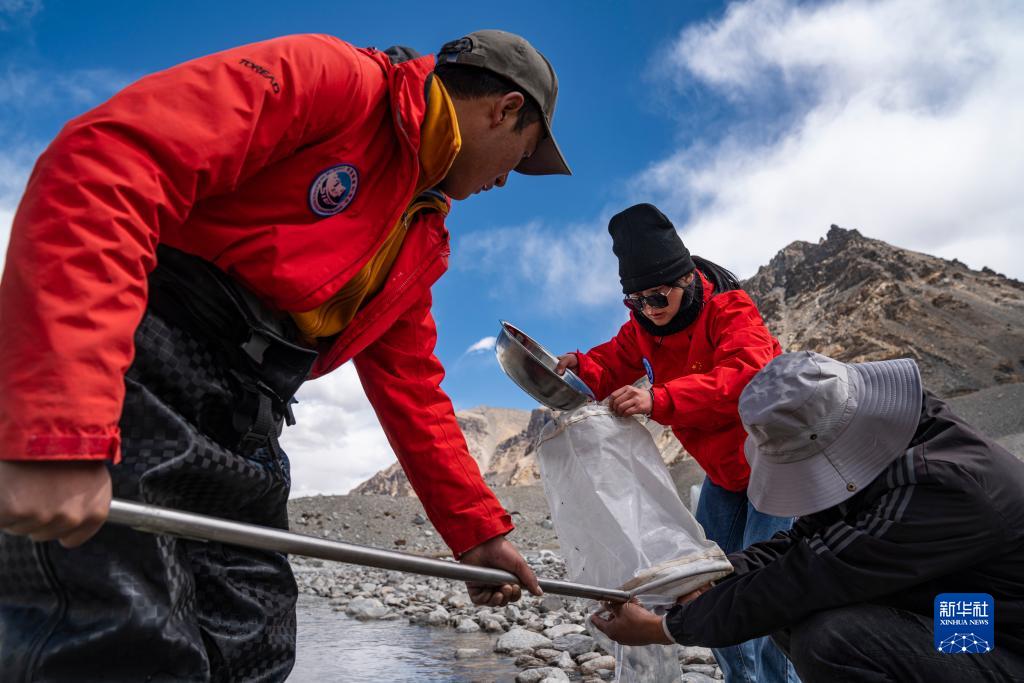 在珠峰登山大本營附近,來自西藏大學(xué)生態(tài)環(huán)境學(xué)院的科考隊員在采集水生生物樣本(5月22日攝)。新華社記者 孫非 攝