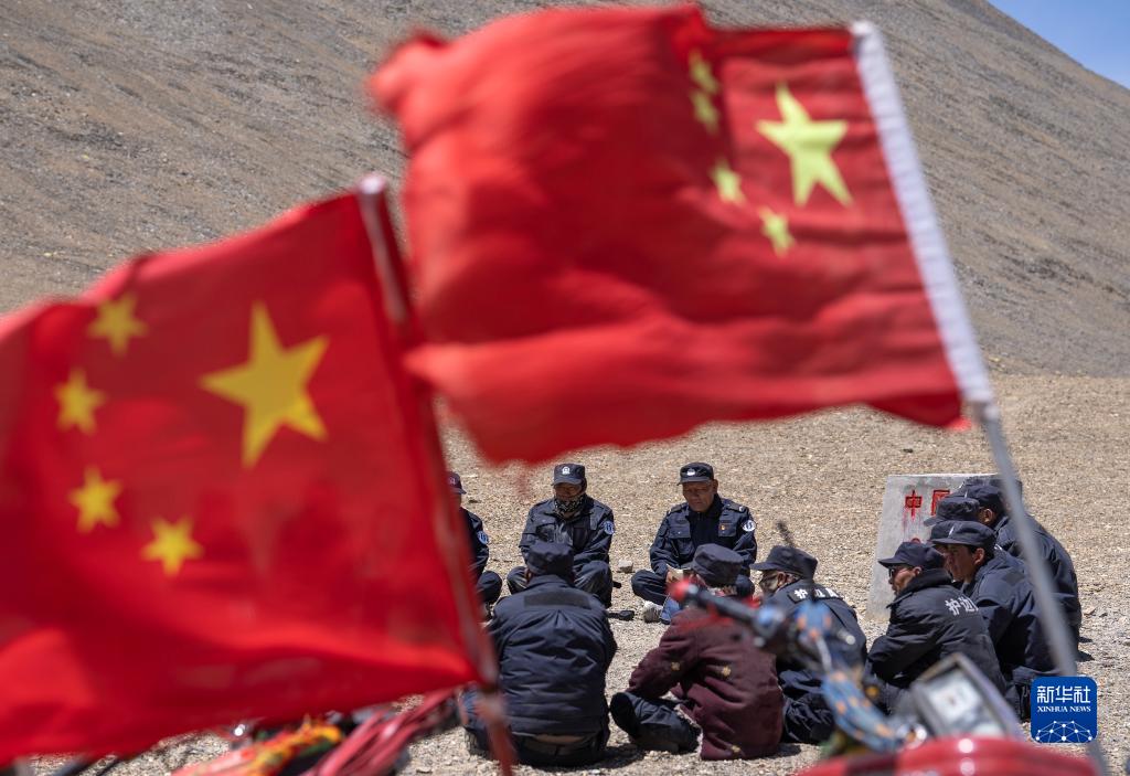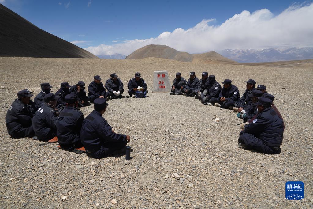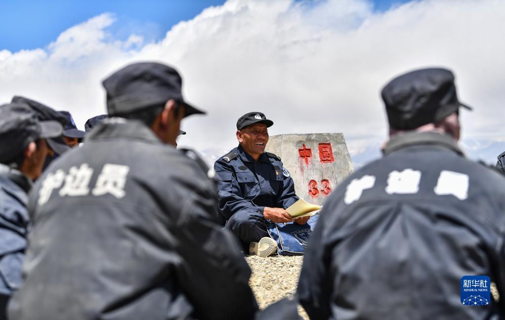 6月2日,在33號(hào)界樁處,護(hù)邊聯(lián)防隊(duì)在隊(duì)長石角(右二)的帶領(lǐng)下學(xué)習(xí)。新華社記者 晉美多吉 攝