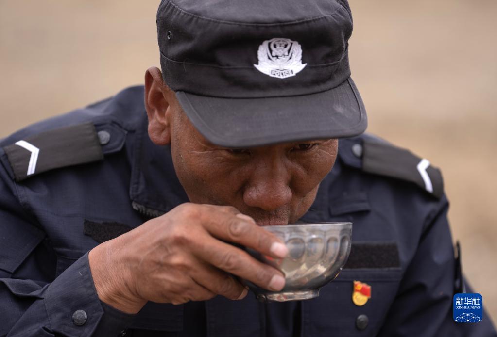 6月2日,午餐時(shí)間,石角在喝酥油茶。新華社記者 費(fèi)茂華 攝