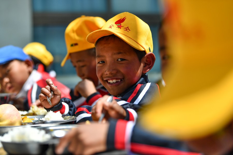 扎西宗鄉(xiāng)完全小學學生在吃午飯(6月5日攝)。