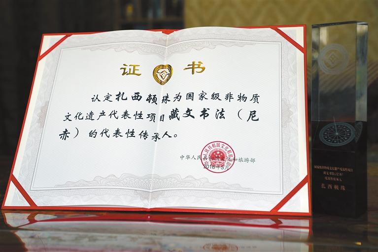 2018年,扎西頓珠被評(píng)為國(guó)家級(jí)非物質(zhì)文化遺產(chǎn)代表性項(xiàng)目藏文書法(尼赤)的代表性傳承人。