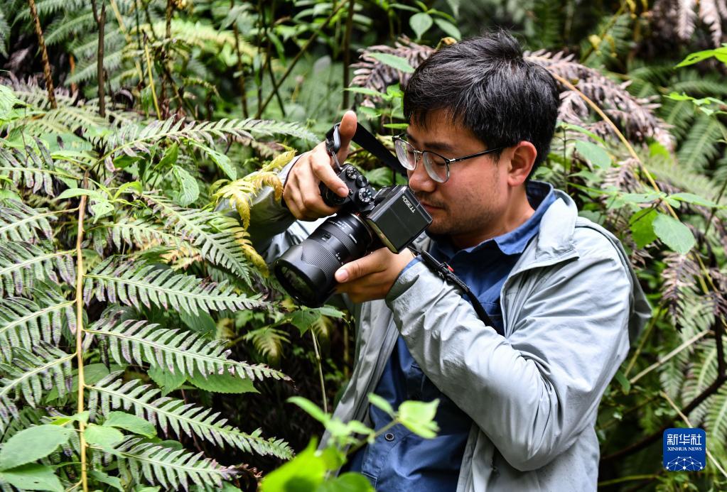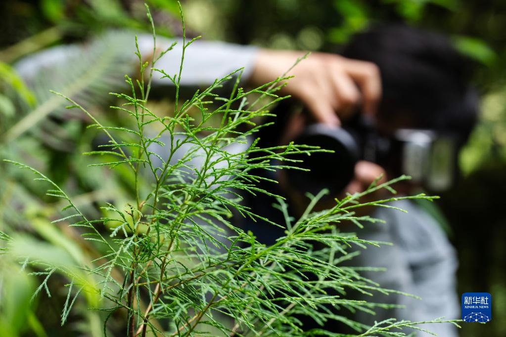 6月15日,中科院植物所博士生王孜在亞洲第一高樹旁拍攝一株西藏柏木的小樹苗。新華社記者 費茂華 攝