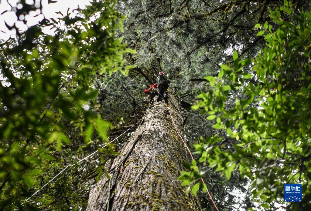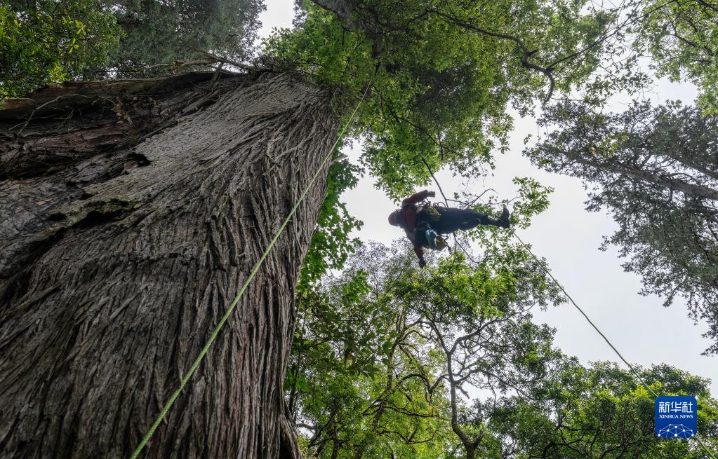 6月15日,國家重要野生植物種質(zhì)資源庫辰山中心負責人鐘鑫(下)和助手在攀爬亞洲第一高樹附近的高樹,采集數(shù)據(jù)。新華社記者 晉美多吉 攝